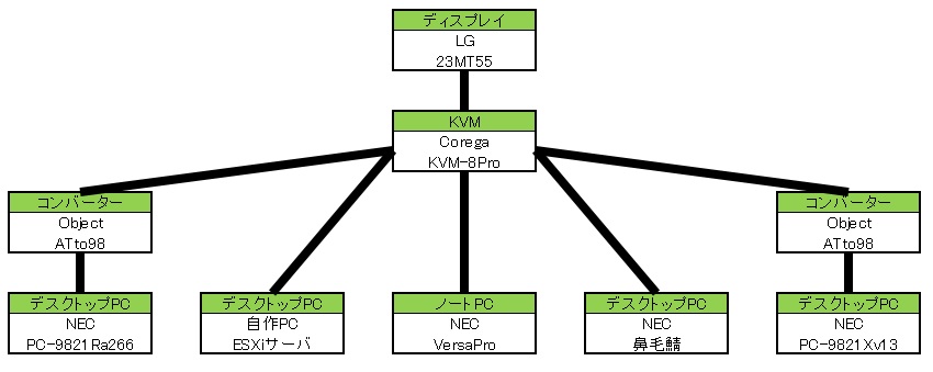 KVMを間に入れることで、他のAT互換機とディスプレイ、キーボード、マウスを共有させる。